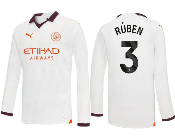Not unlike a goalie making a diving save, this 2023-24 Manchester City 3 Ruben Dias Away White Long Sleeve Jersey will be a highlight in your collection of game day gear. Designed with adidas' AEROREADY technology to absorb moisture, this jersey is specifically constructed to keep you comfortable. The Manchester City graphics provide that on-pitch aesthetic that you love