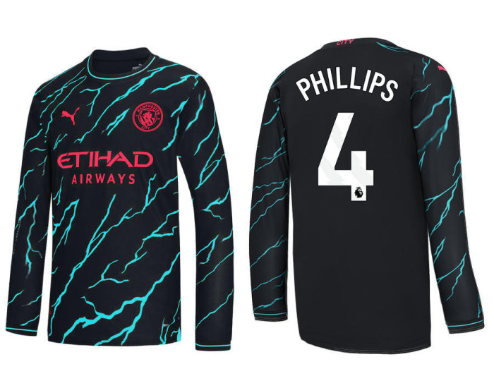 Not unlike a goalie making a diving save, this 2023-24 Manchester City 4 Kalvin Phillips Third Black Long Sleeve Jersey will be a highlight in your collection of game day gear. Designed with adidas' AEROREADY technology to absorb moisture, this jersey is specifically constructed to keep you comfortable. The Manchester City graphics provide that on-pitch aesthetic that you love