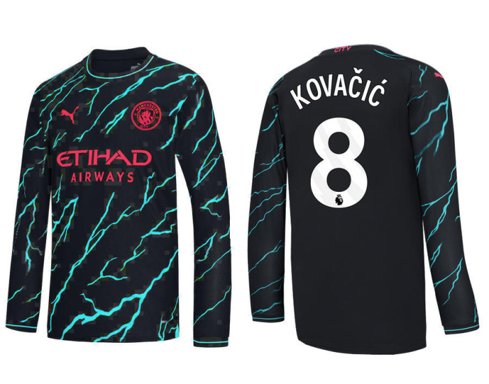Not unlike a goalie making a diving save, this 2023-24 Manchester City 8 Mateo Kovacic Third Black Long Sleeve Jersey will be a highlight in your collection of game day gear. Designed with adidas' AEROREADY technology to absorb moisture, this jersey is specifically constructed to keep you comfortable. The Manchester City graphics provide that on-pitch aesthetic that you love