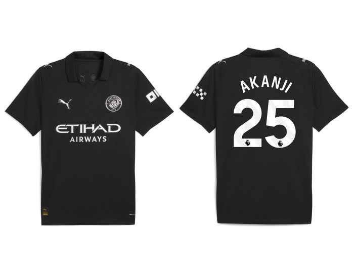 As an official Manchester City shirt from the 2025-2026 season, it carries the club's prestigious crest and is available with Manuel Akanji's dynamic number 25. The sleek, dark design reflects the power and intensity he brings to the pitch every match.