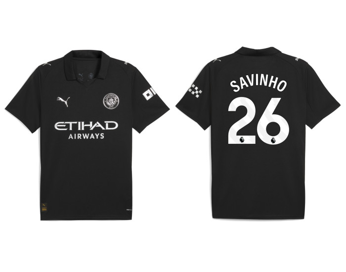 As an official Manchester City shirt from the 2025-2026 season, it carries the club's prestigious crest and is available with Savinho's dynamic number 26. The sleek, dark design reflects the power and intensity he brings to the pitch every match.