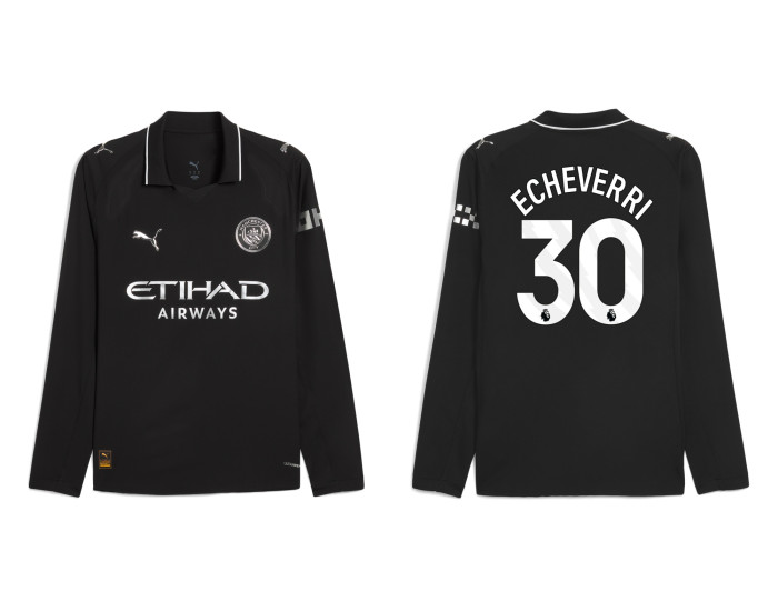 Experience the thrill of speed and skill with the 2025-2026 Manchester City 30. Claudio Echeverri Replica Black Away Long Sleeve Jersey. This kit captures the essence of one of soccer's most exciting wingers, designed for fans who appreciate explosive talent and modern style.