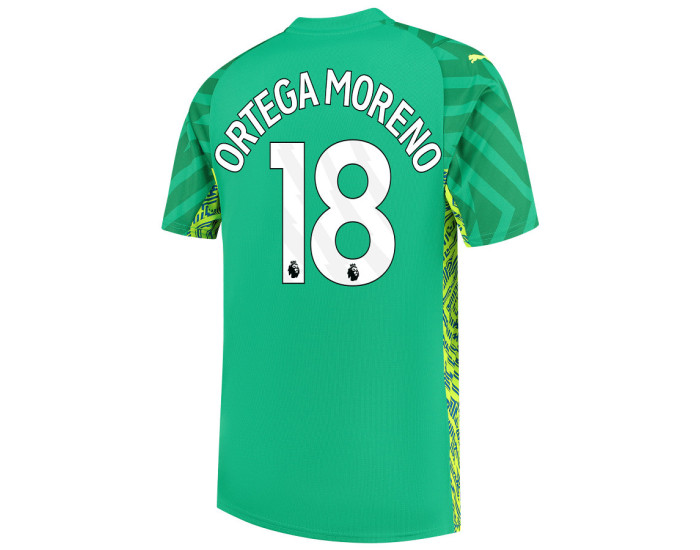 Not unlike a goalie making a diving save, this 2023-24 Manchester City 18 Ortega Moreno green Goalkeeper Jersey will be a highlight in your collection of game day gear. Designed with adidas' AEROREADY technology to absorb moisture, this jersey is specifically constructed to keep you comfortable. The Manchester City graphics provide that on-pitch aesthetic that you love