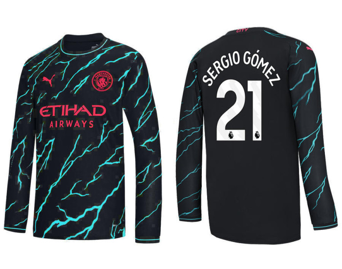 Look and feel like the real deal when you add Youth 2023-24 Manchester City 21 Sergio Gomez Third Black Long Sleeve Jersey to your Manchester City collection. This adidas gear features AEROREADY technology and ventilated, that work together to keep you dry and comfortable all game long. Its exciting Manchester City graphics will motivate you to cheer on your favorite team as they take the pitch.