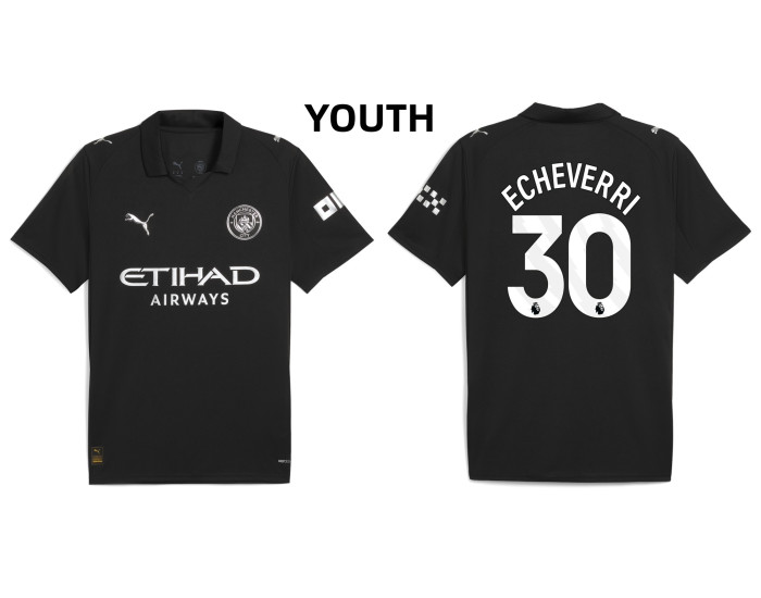 Experience the thrill of speed and skill with the Youth 2025-2026 Manchester City 30. Claudio Echeverri Authentic Black Away Jersey. This kit captures the essence of one of soccer's most exciting wingers, designed for fans who appreciate explosive talent and modern style.