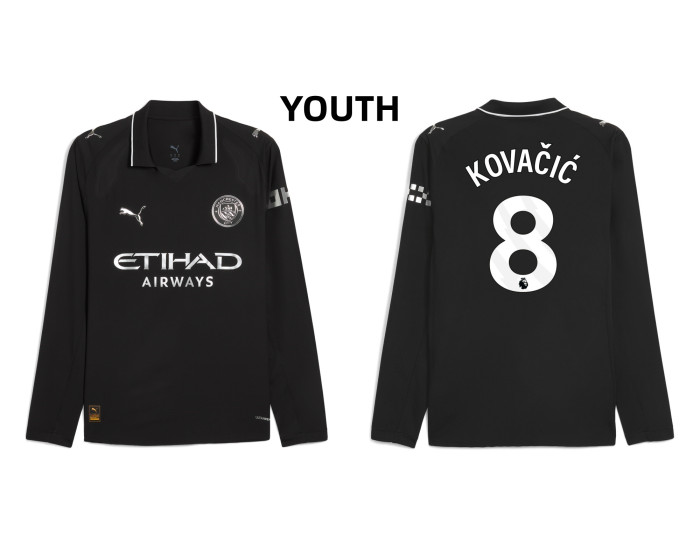 Experience the thrill of speed and skill with the Youth 2025-2026 Manchester City 8. Mateo Kovacic Authentic Black Away Long Sleeve Jersey. This kit captures the essence of one of soccer's most exciting wingers, designed for fans who appreciate explosive talent and modern style.