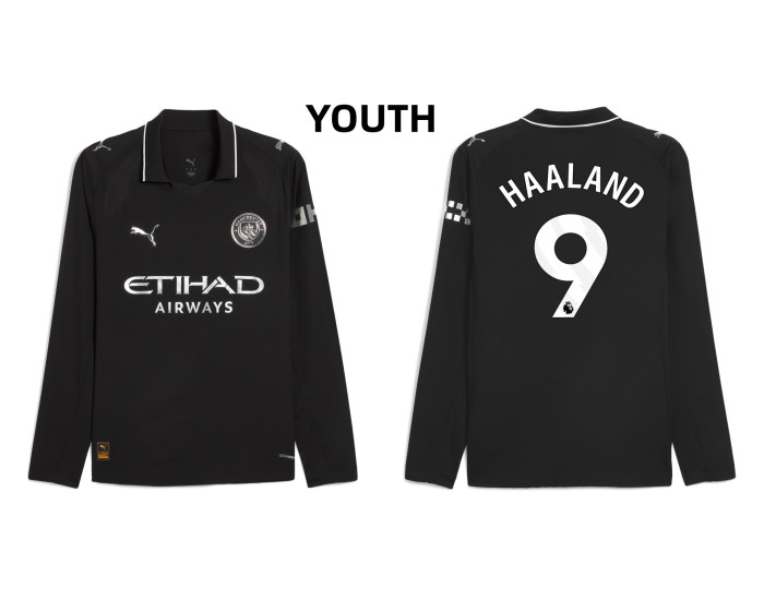 Experience the thrill of speed and skill with the Youth 2025-2026 Manchester City 9. Erling Haaland Authentic Black Away Long Sleeve Jersey. This kit captures the essence of one of soccer's most exciting wingers, designed for fans who appreciate explosive talent and modern style.