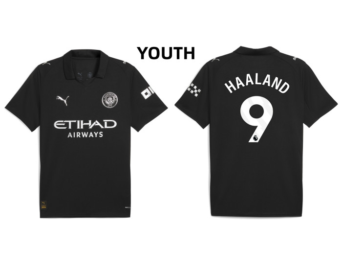 Experience the thrill of speed and skill with the Youth 2025-2026 Manchester City 9. Erling Haaland Authentic Black Away Jersey. This kit captures the essence of one of soccer's most exciting wingers, designed for fans who appreciate explosive talent and modern style.